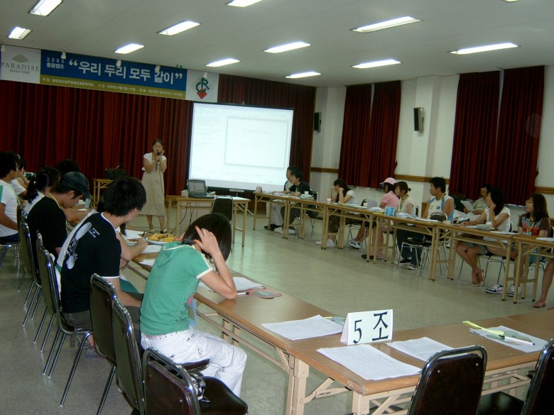 쉿! 이 곳에 모인 많은 친구들의 움직임이 심상치 않네요~ 2005년 통합캠프 "우리두리모두같이"라는 구호 아래 뭉친 친구들! 오늘은 통합캠프에 앞서 사전모임을 갖는 날이랍니다. 자원활동의 이해, 장애바로알기, 장애체험를 통해 오는 8일부터 시작되는 2박3일간의 통합캠프를 위한 철저한 준비가 시작되었습니다. 우리 친구들 귀를 쫑긋 세우며 장애 친구를 만나는 그 날이 하루빨리 기다려집니다.